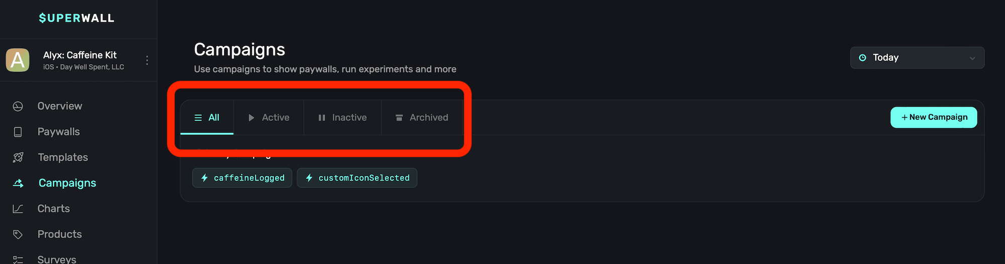 - Inactive: Campaigns that are not serving paywalls in production, but can be quickly re-enabled.