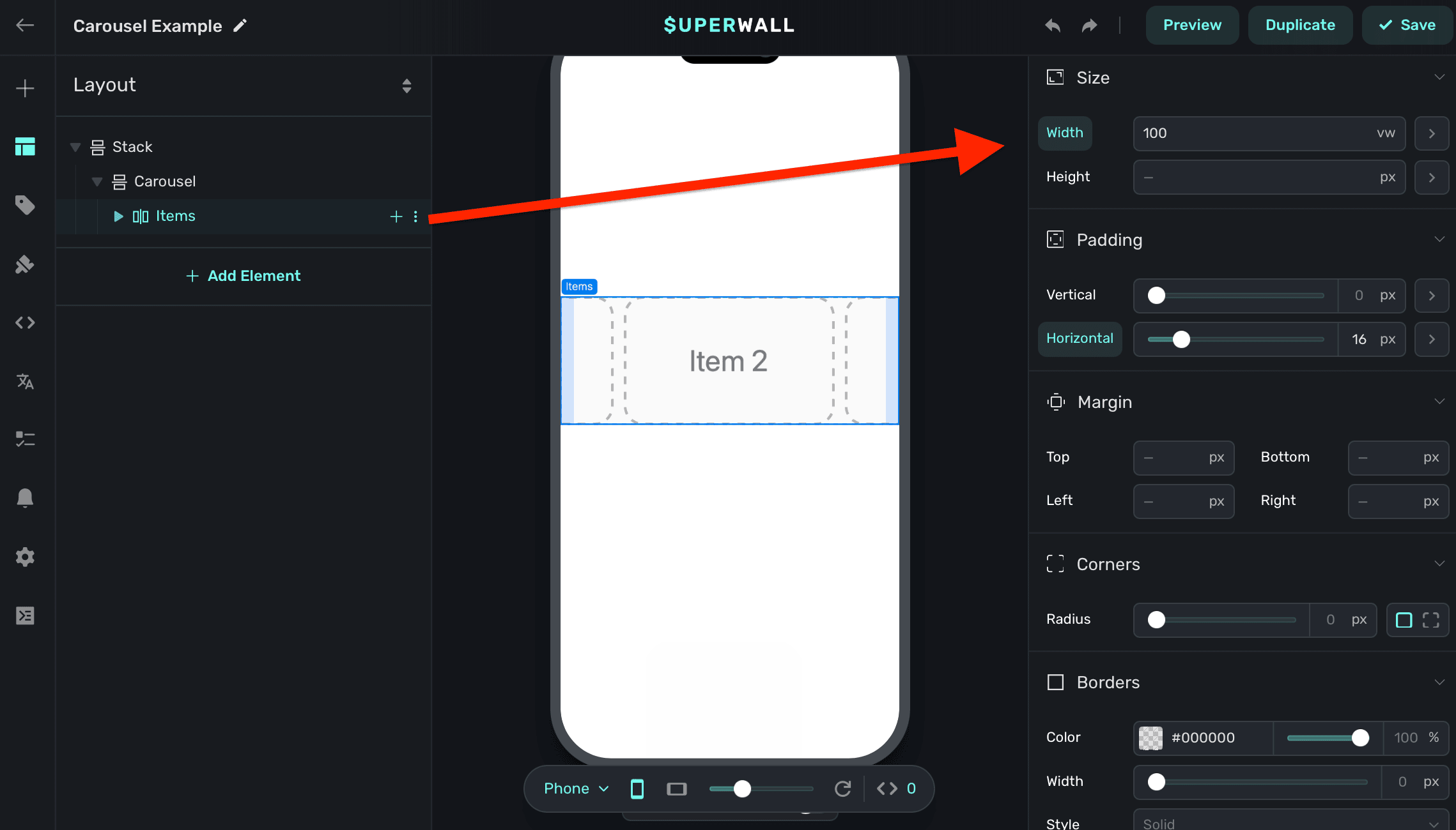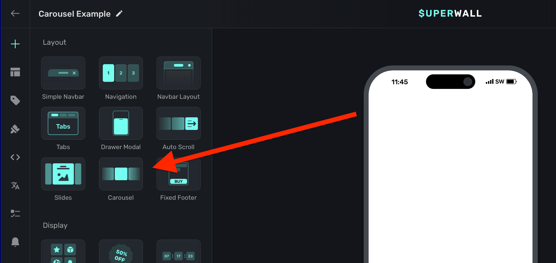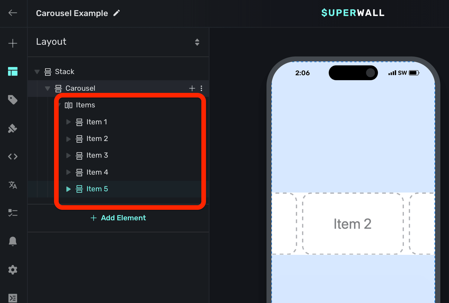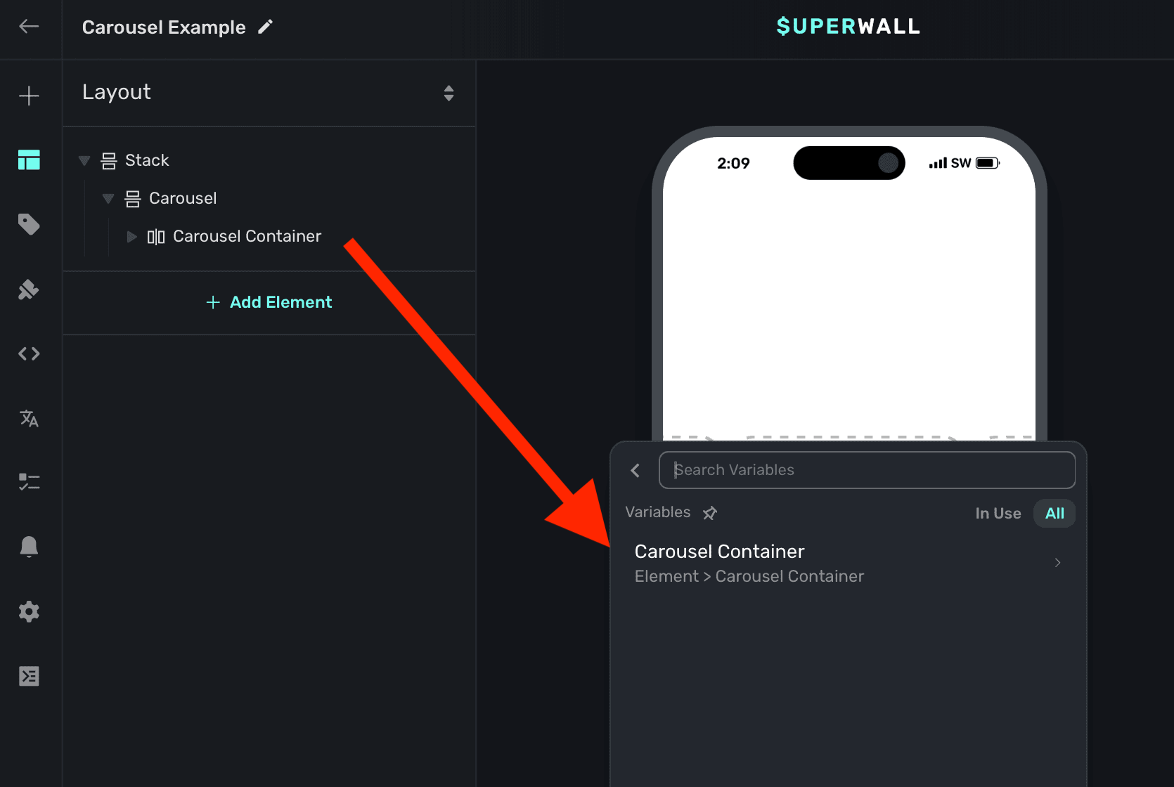 When a carousel element is added, Superwall automatically creates an element variable for it (accessed through the Variables tab in the left sidebar, or the variables button in the floating toolbar). Its name will match whatever is in the element hierarchy in the left sidebar: