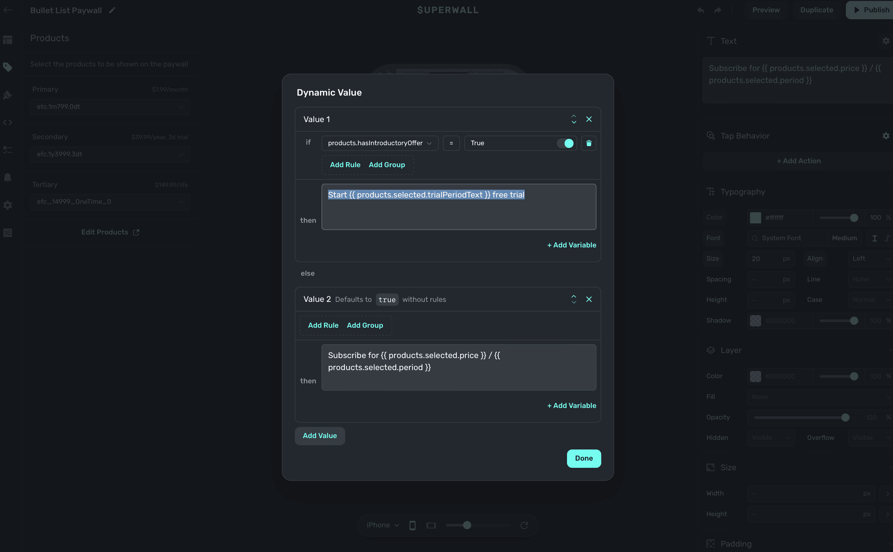 The dynamic values editor works like most control flow interfaces. You set a condition, and choose what should happen when it's met. You can chain multiple conditions together, too. Or, simply use an if/else format.