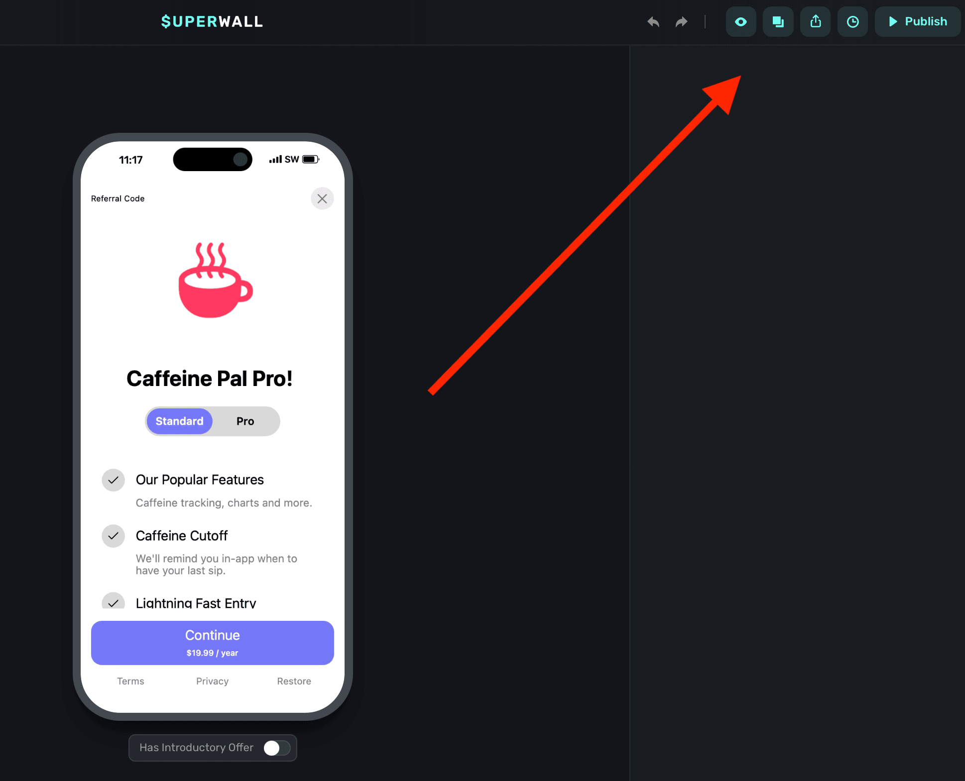 - History: View paywall edit history and revert to a previous version. See "Paywall history" below for more.