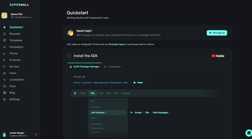 When you log in for the first time or add a new app, the Overview page will reflect a "Quickstart" wizard to help you get up and running. Complete the interactive checklist to finish your Superwall integration: