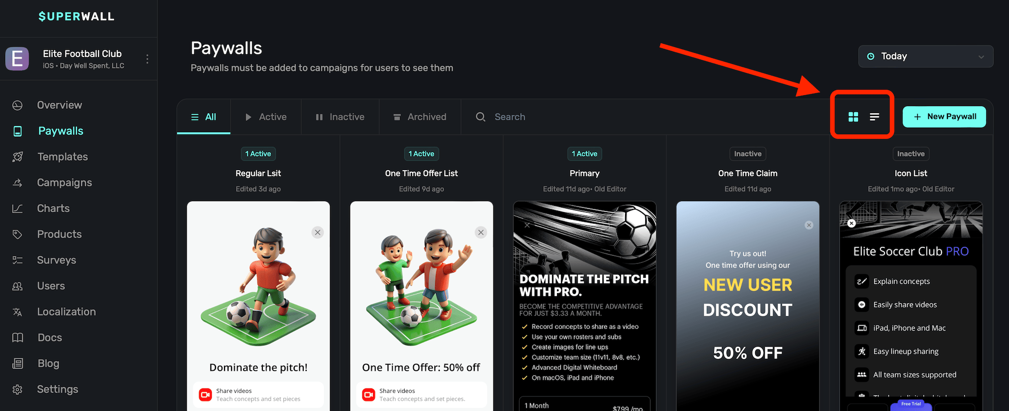 To create a new paywall, click + New Paywall at the top-right. For more on creating paywalls, check out this doc.