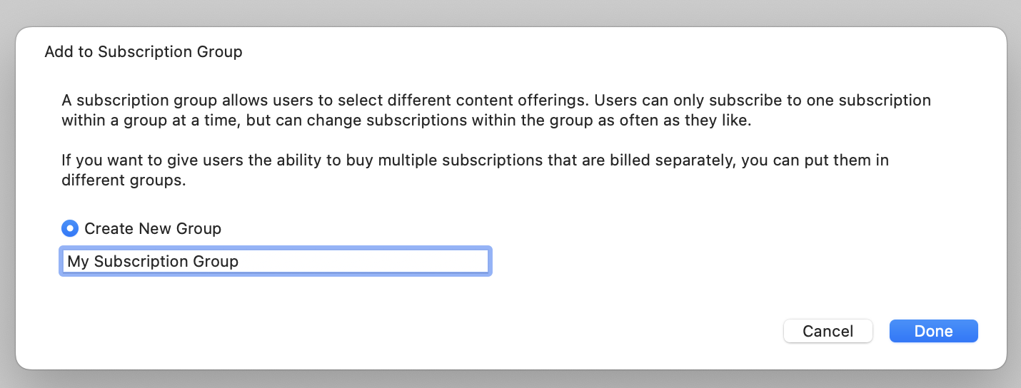 Enter a name for a new subscription group and click Done. The subscription group name should match one that is set up for your app in App Store Connect, but it's not a requirement. That means you can test your subscription groups and products in the simulator and then create the products in App Store Connect later: