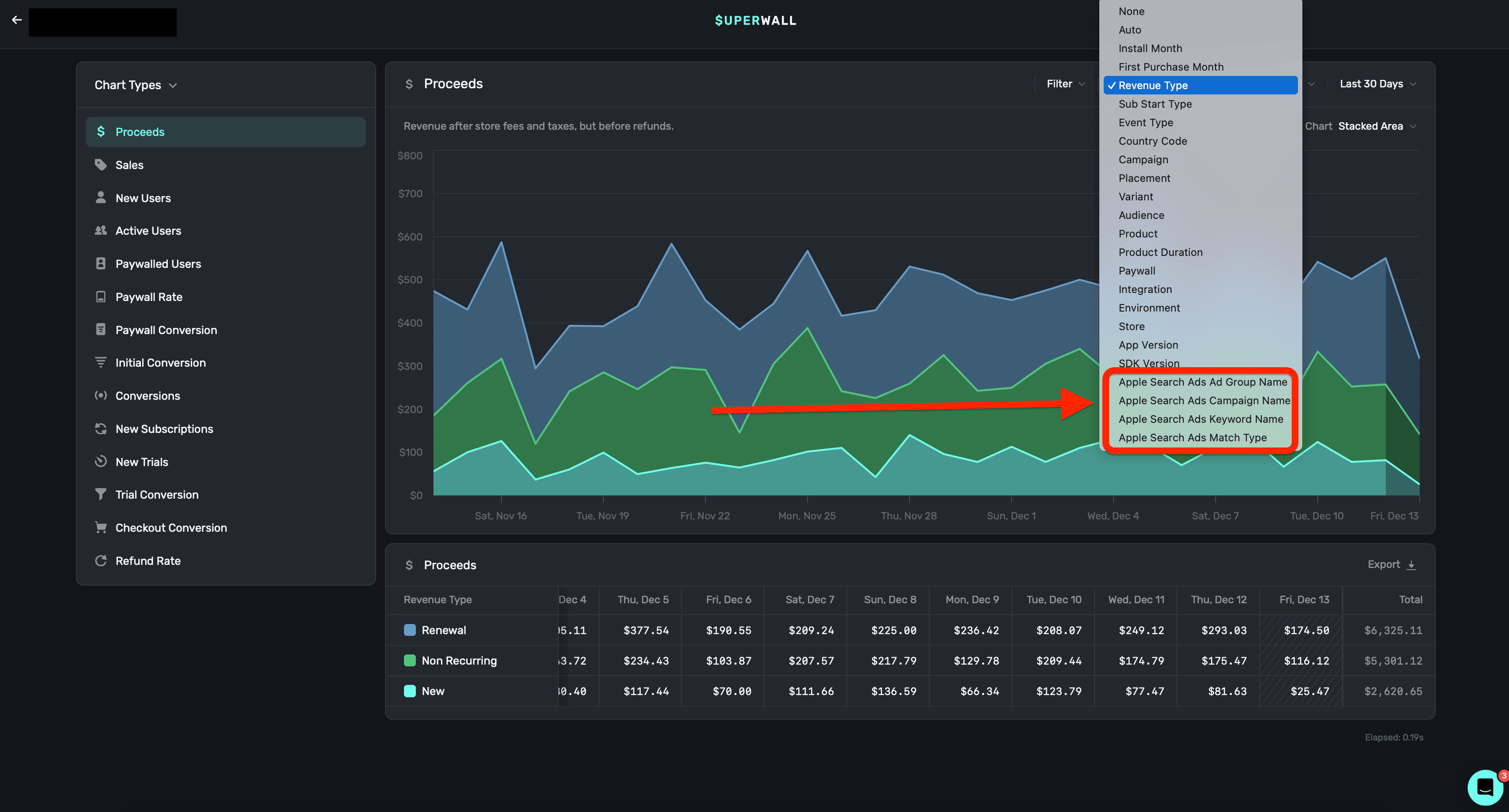 Use data from Apple Search Ads in our charts as a breakdown and filter: