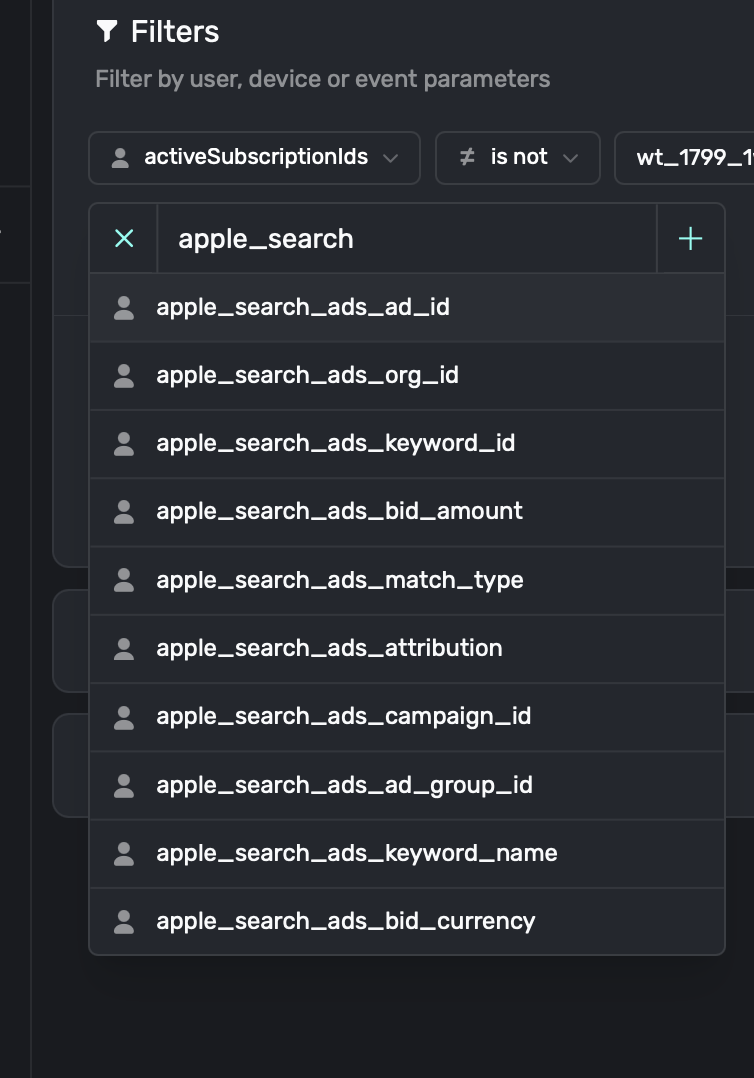 • You can leverage search ad data in your campaigns. This opens up the ability to do things like showing a specific paywall to a user who was acquired via a search ad, tailor messaging from the keyword that was used, and more.