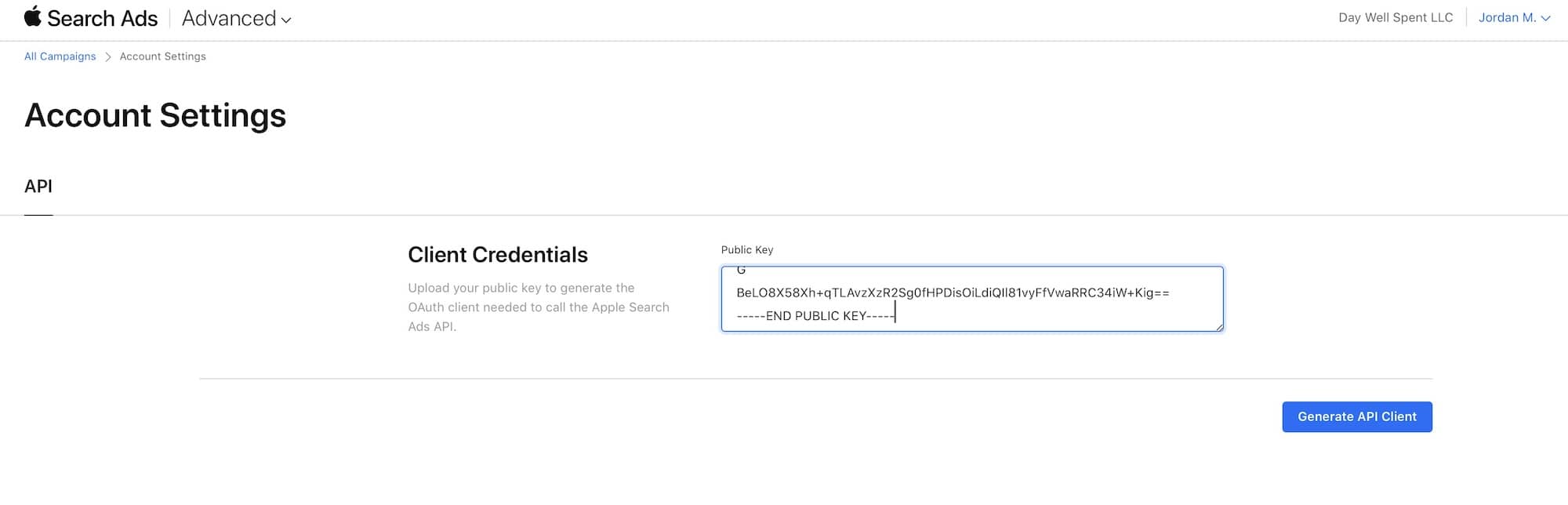 4. Back in Apple Search Ads, paste the public key under Public Key and click Generate API Client: