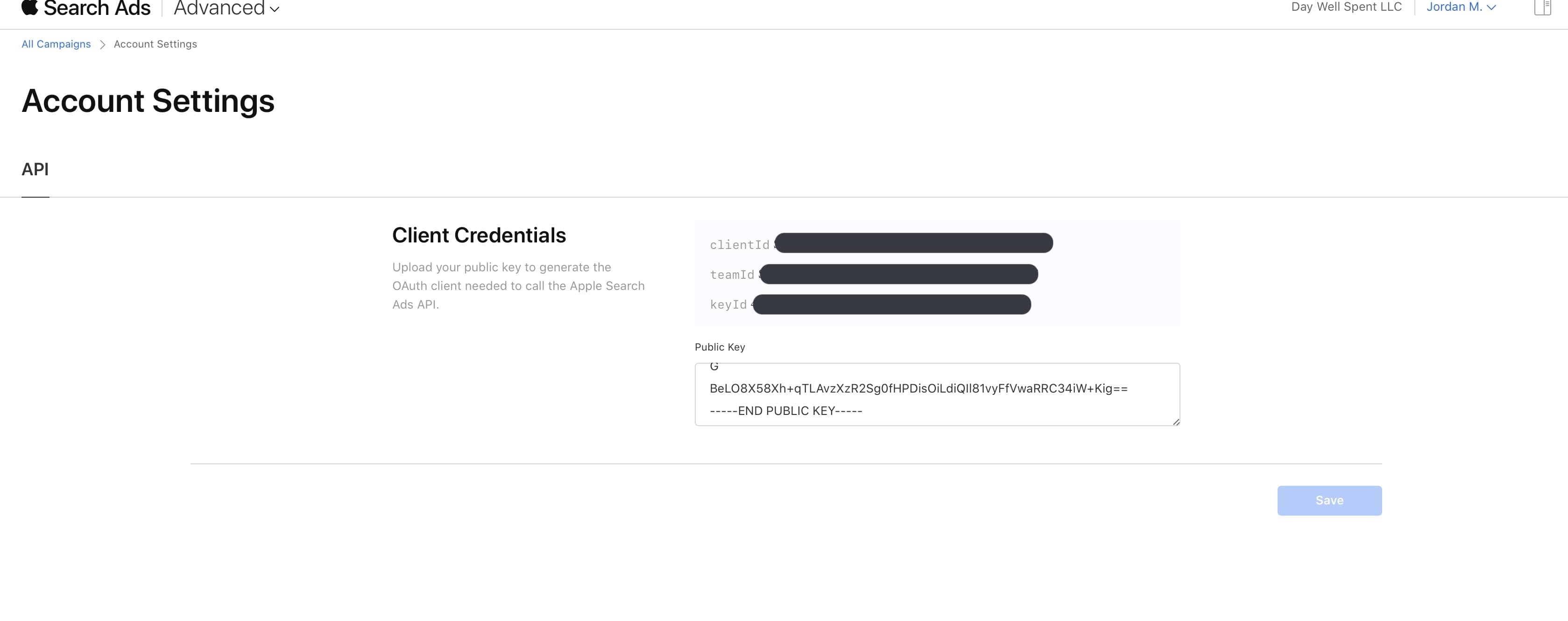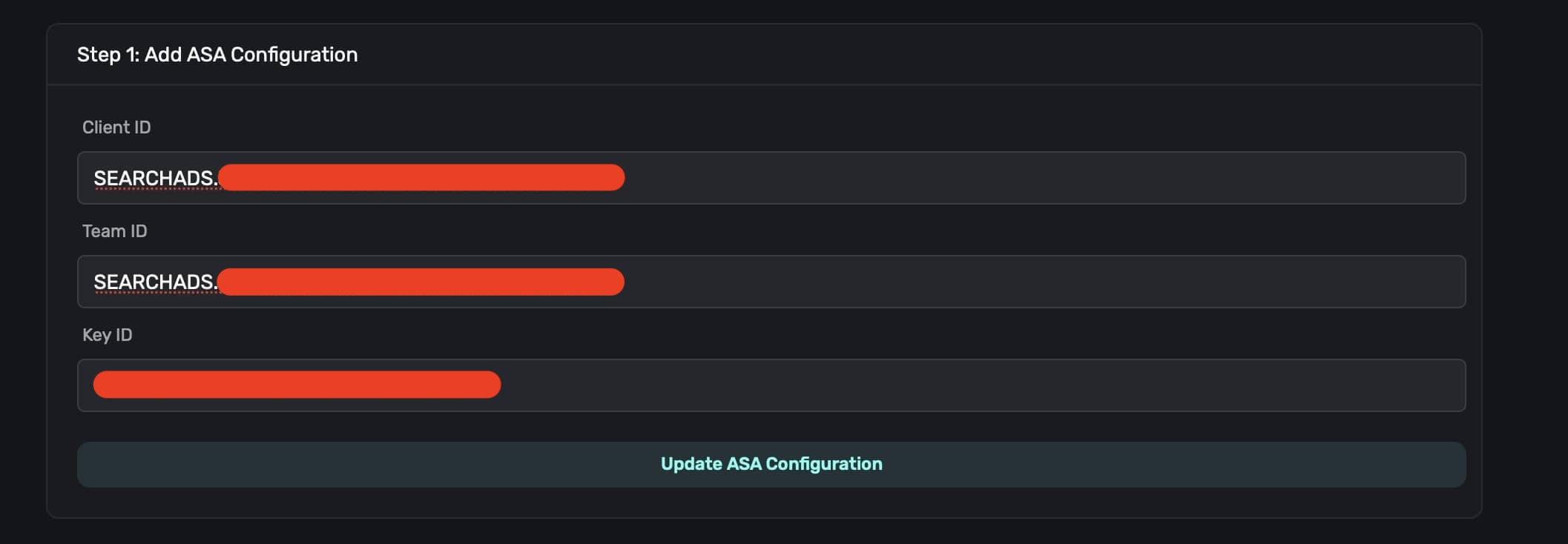 Now, you should see three values that have been generated by Apple Search Ads, a client ID, team ID and key ID.