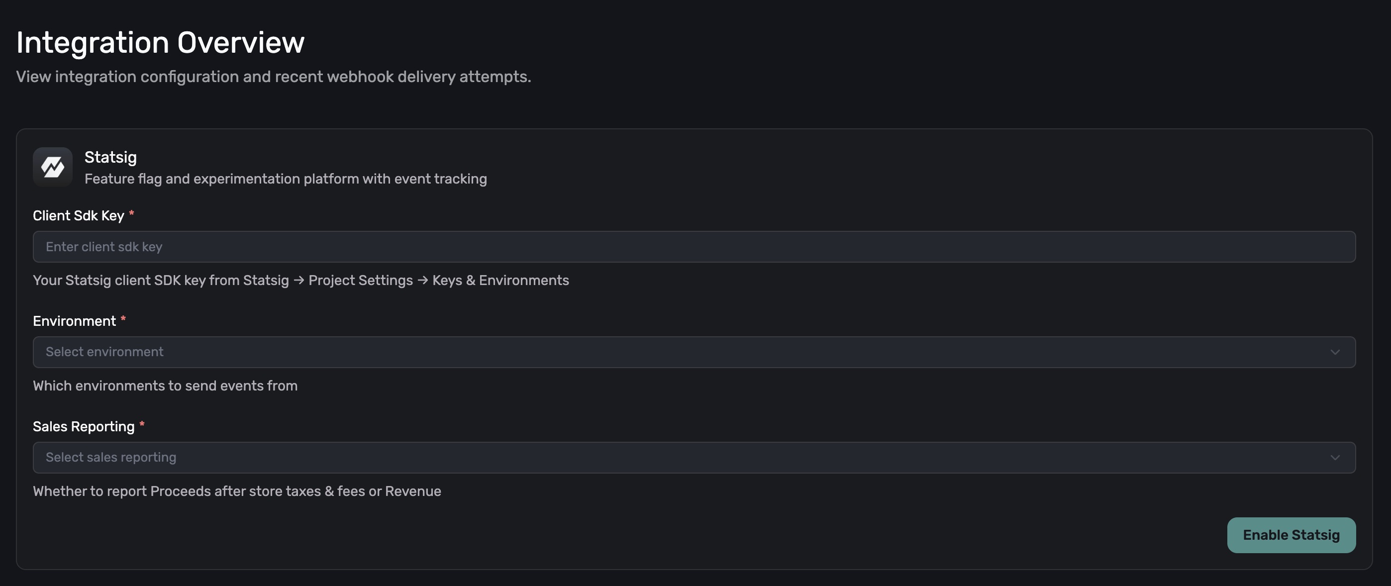 Fill out the following fields and click the Enable Statsig button at the bottom right to save your changes: